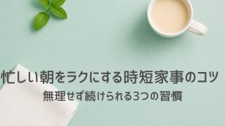 暮らしの工夫 忙しい朝をラクにする時短家事のコツ|無理せず続けられる3つの習慣 朝の準備、バタバタしていませんか?この記事では、朝のバタバタを減らす「ゆる時短家事術」をご紹介します。動線の見直しや収納、家電活用など、忙しいママが無理なく続けられるコツをまとめました。少しでも朝に余裕がほしい方は、ぜひごお読みください。 2025.10.30 暮らしの工夫