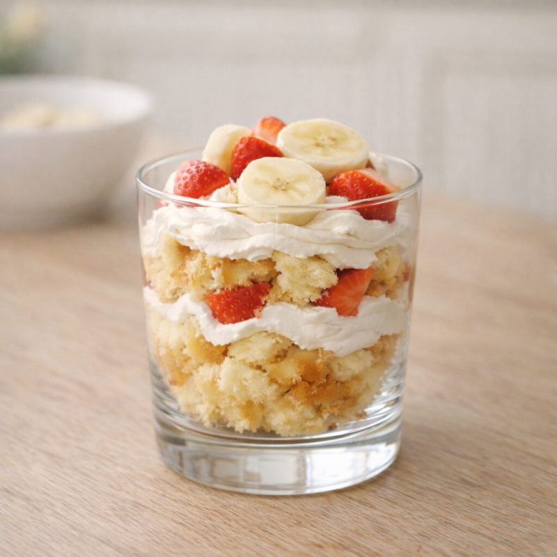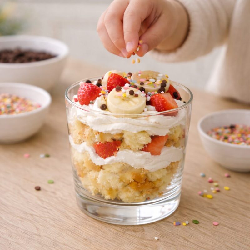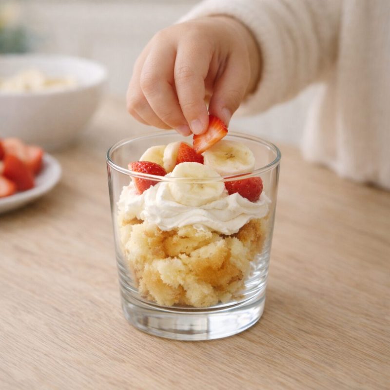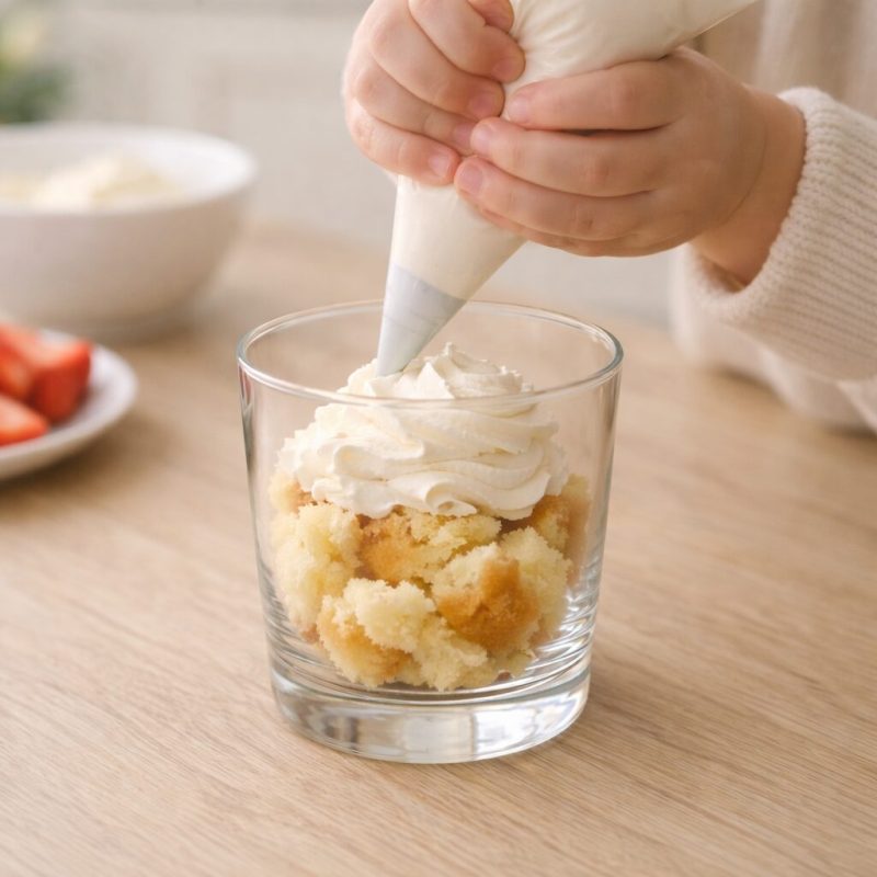 パフェ風カップケーキは、切ったり焼いたりする必要がなく、市販のスポンジやクリームを使って重ねるだけで完成します。