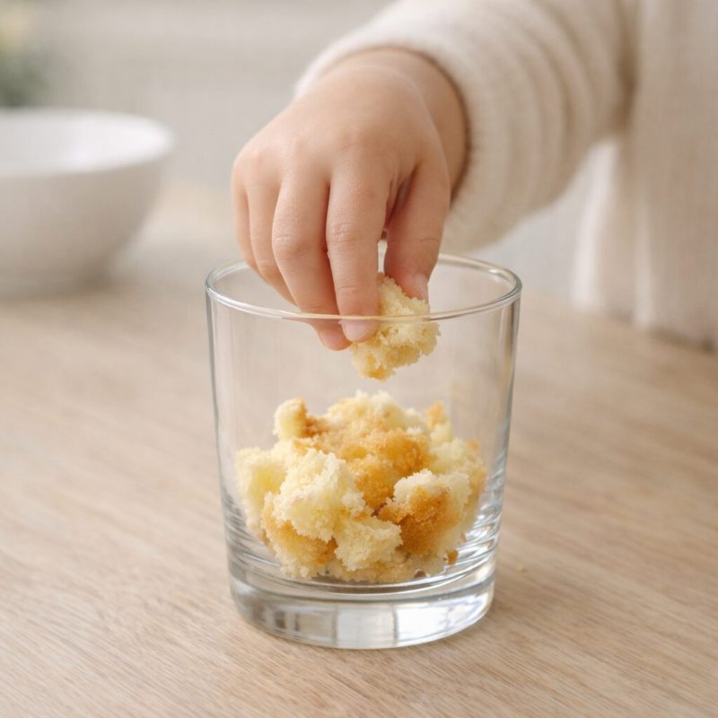 包丁を使わず、コップに入れて重ねるだけなので、子どもも安心して参加できます。