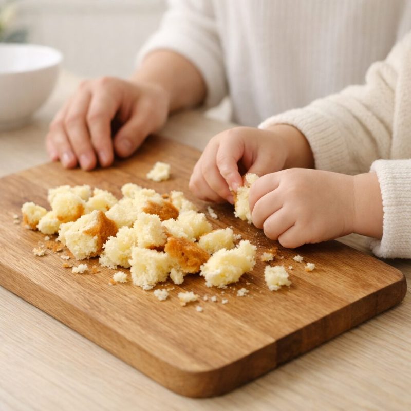市販のスポンジケーキを、手で食べやすい大きさにちぎります。